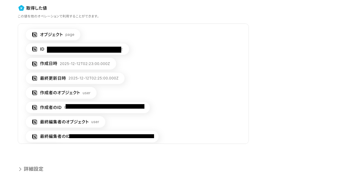 - 続いて、Notionの「レコードを取得する(ID検索)」で、作成されたページの詳細情報を取得します
