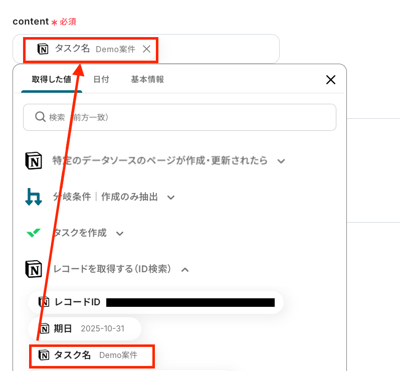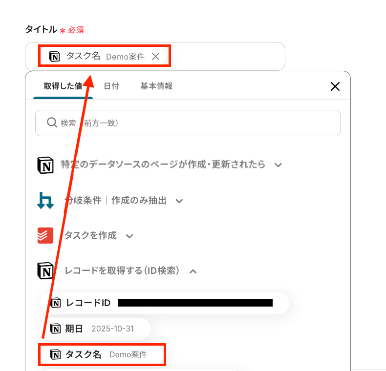 Todoistの「タスクを作成」設定時と同じように、「取得した値」を使って設定してくださいね!