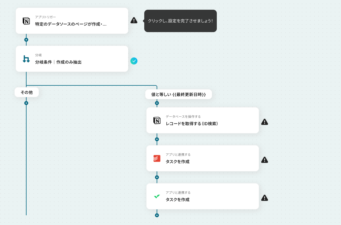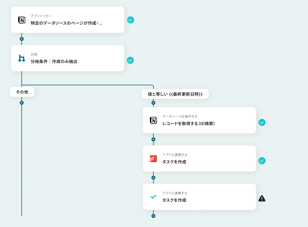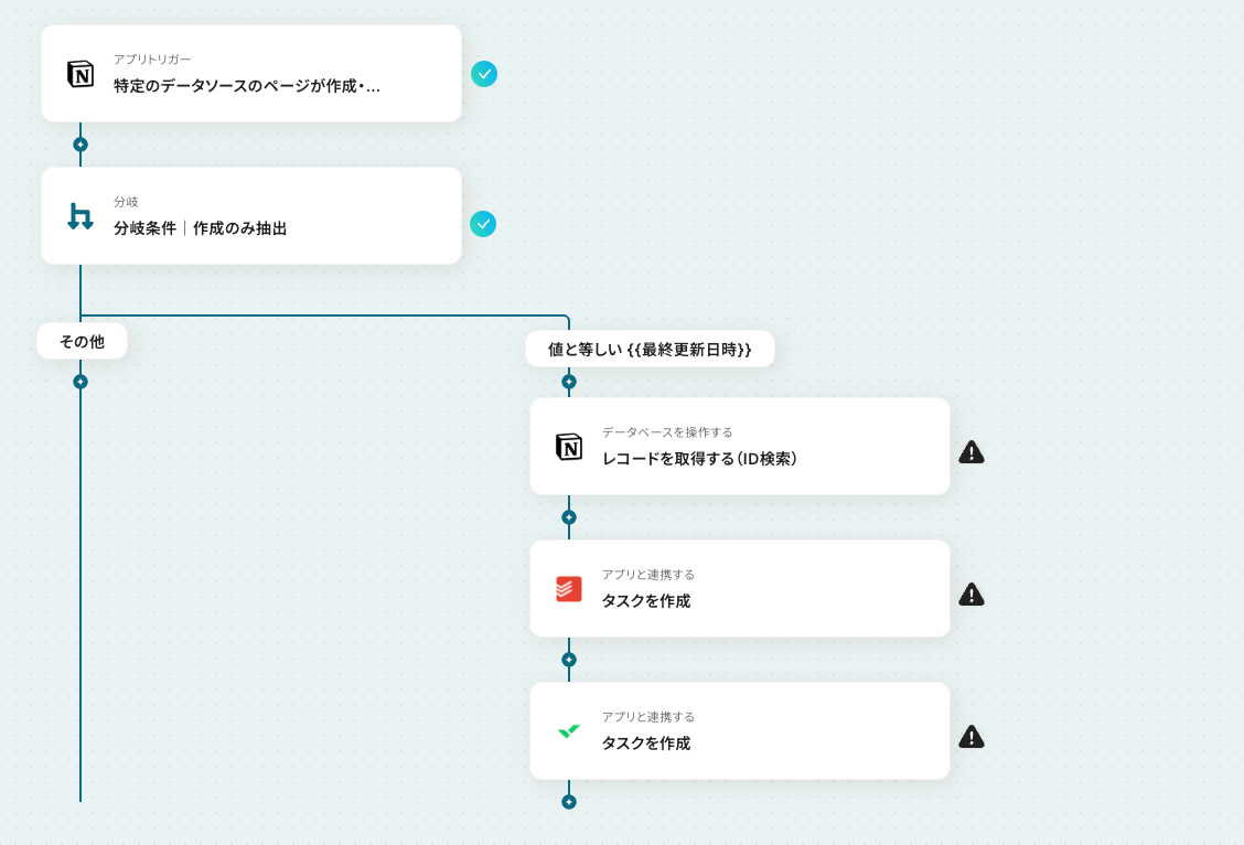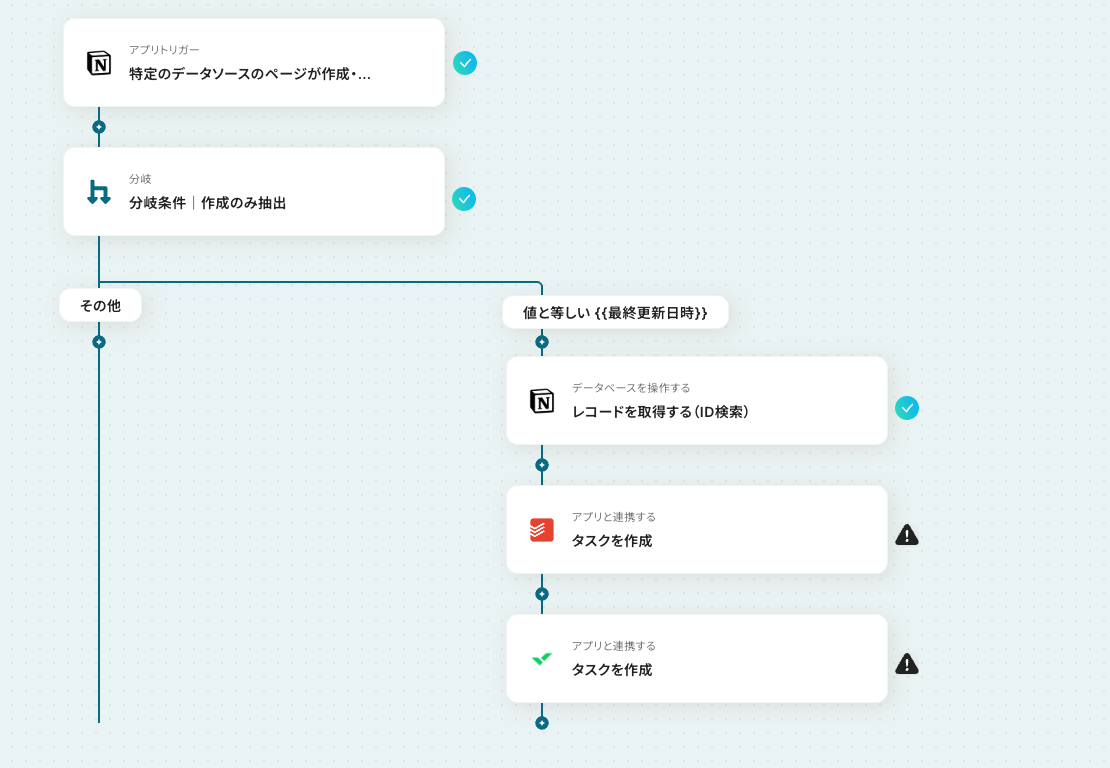 Notionの「レコードを取得する(ID検索)」アクションの下に、「分岐する」オペレーションを設定することで、指定する条件に一致するタスクのみを連携できるようになります。