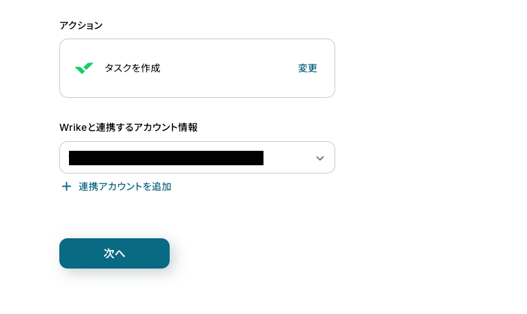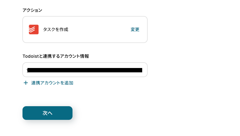 これまでと同様に「連携アカウントとアクションを選択」の設定内容を確認し、アクションは「タスクを作成」のままにして「次へ」を押しましょう。