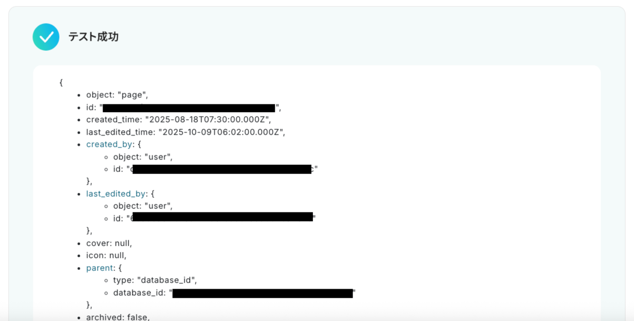 設定が完了したら「テスト」をクリックし、レコードの詳細情報が「取得した値」に抽出されることを確認してくださいね!