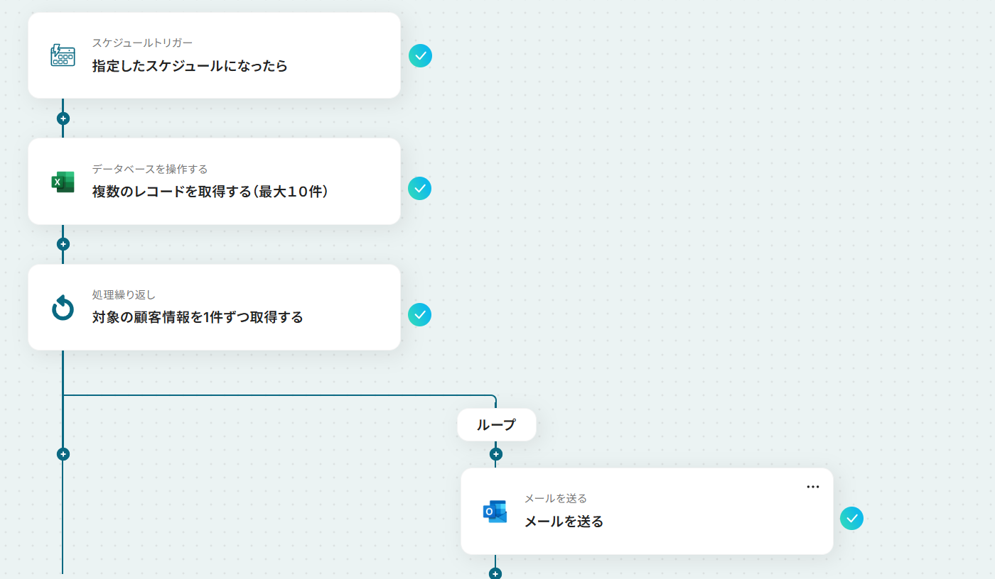 このワークフローを活用すれば、指定した日時にMicrosoft Excelから自動で情報を取得し、Outlookで定型メールを送信する一連の流れを自動化できます。