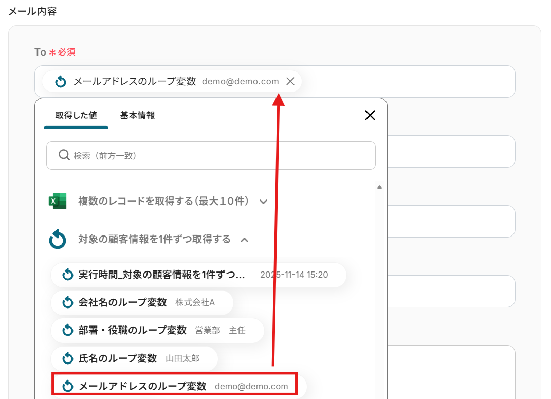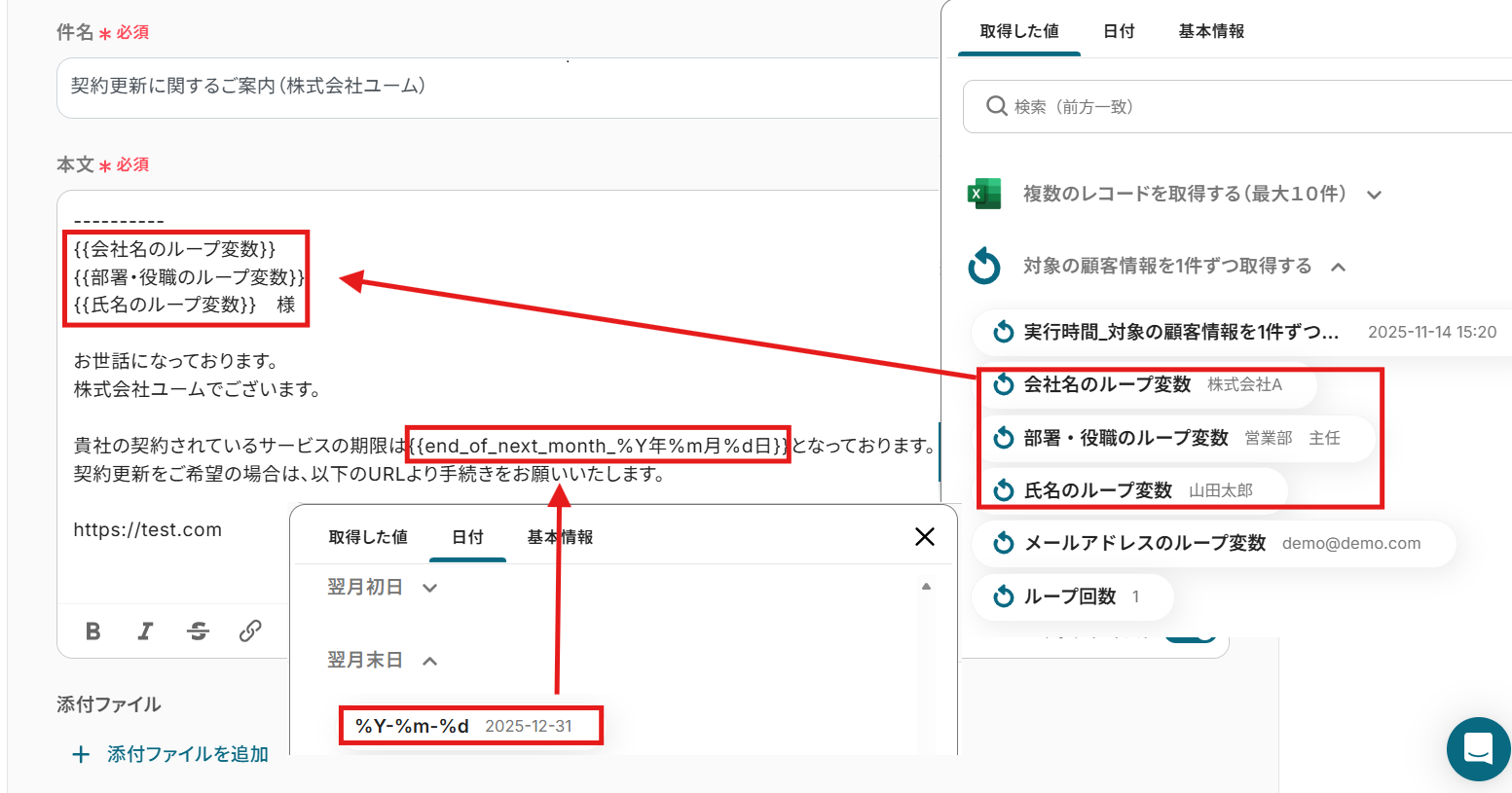 これにより、Microsoft Excelのレコードごとの情報をOutlookへ動的に反映できます。