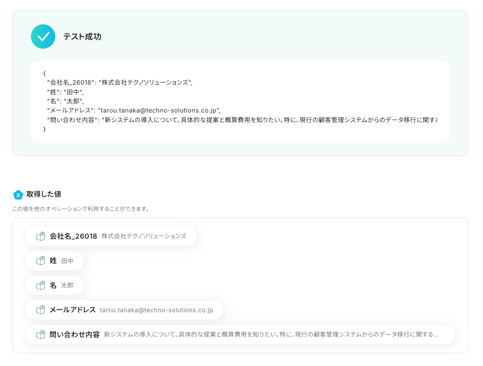テストが成功すると、以下のように「取得した値」が表示されます。