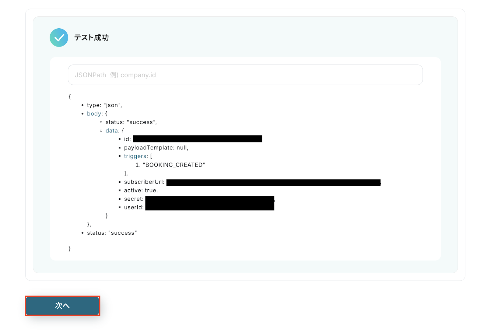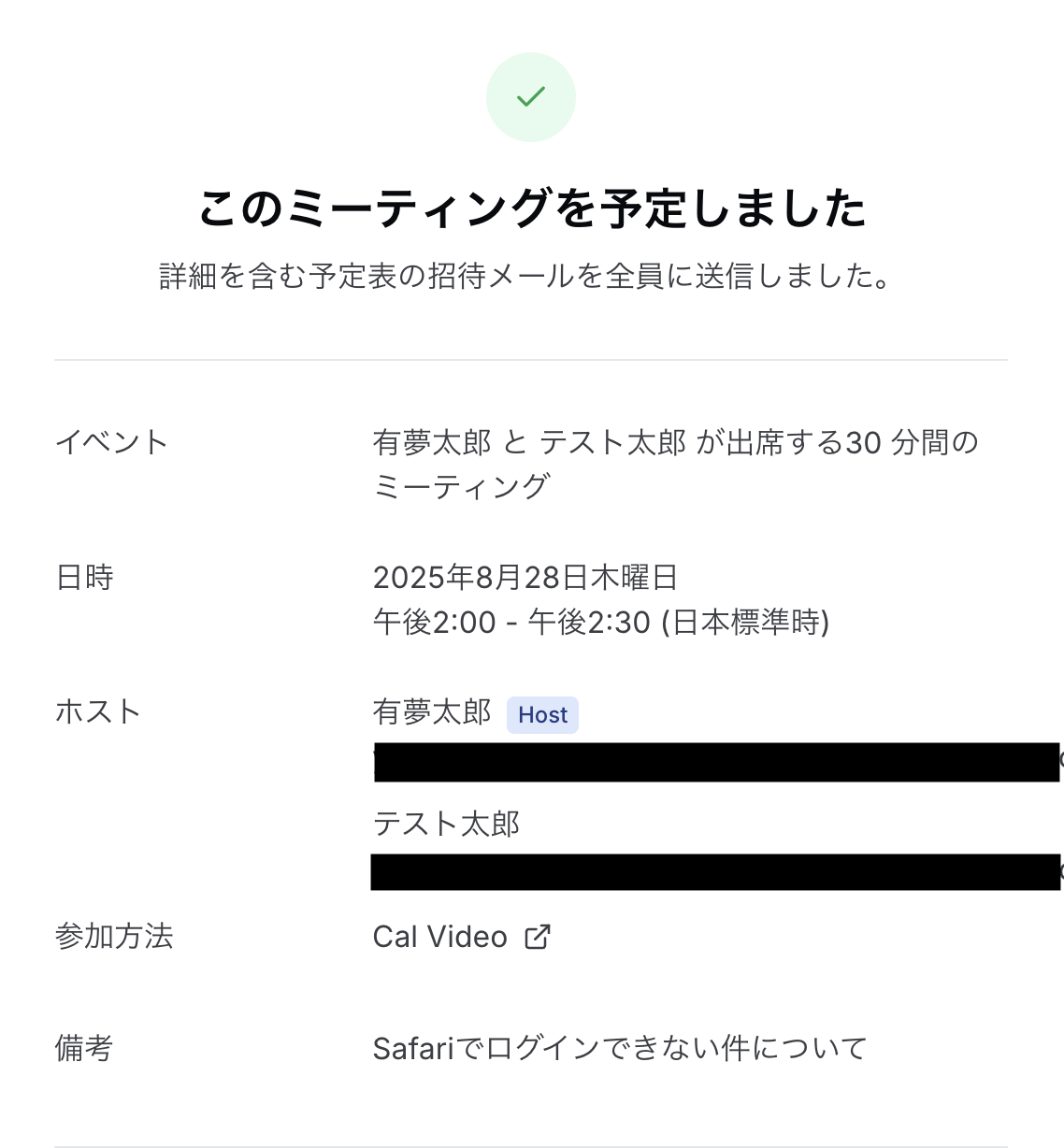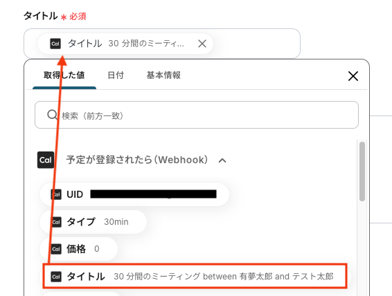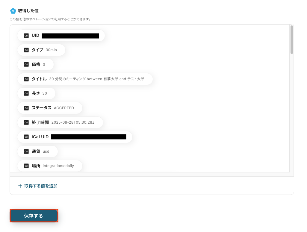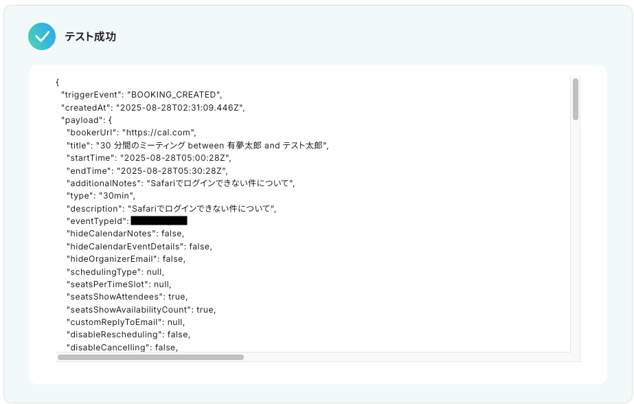 テストに成功すると、Cal.comに登録された予定に関する情報が一覧で表示されます。