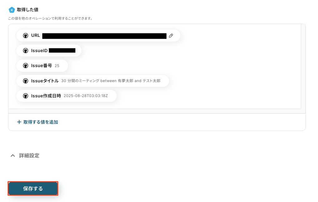 以下の画像の取得した値(=アウトプット)を利用して、GitHubへIssueの作成が可能です。