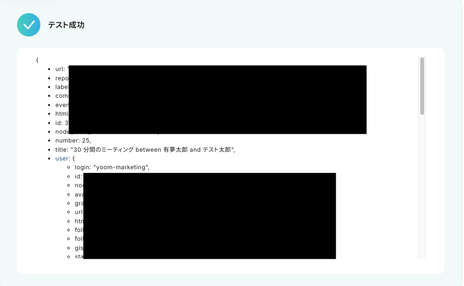 Cal.comとYoomのWebhook接続が問題なければ、以下のように「テスト成功」のメッセージが表示されます。