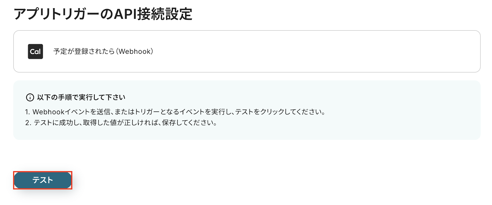 「テスト」をクリックして、YoomがCal.comからWebhookを正しく受け取れるか確認しましょう。