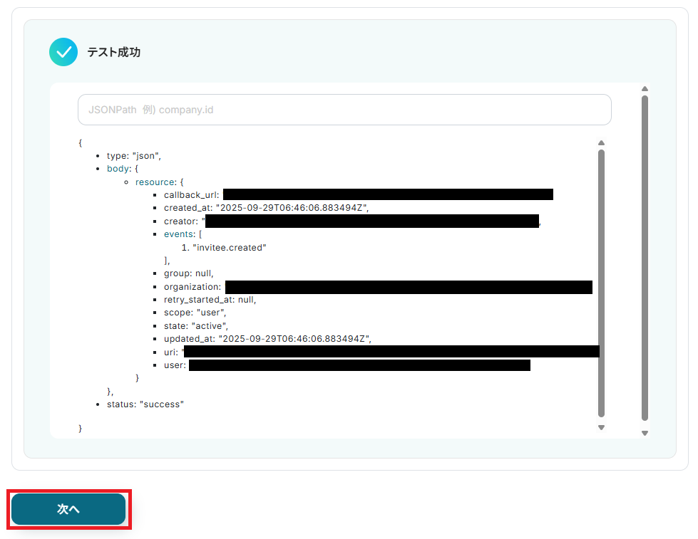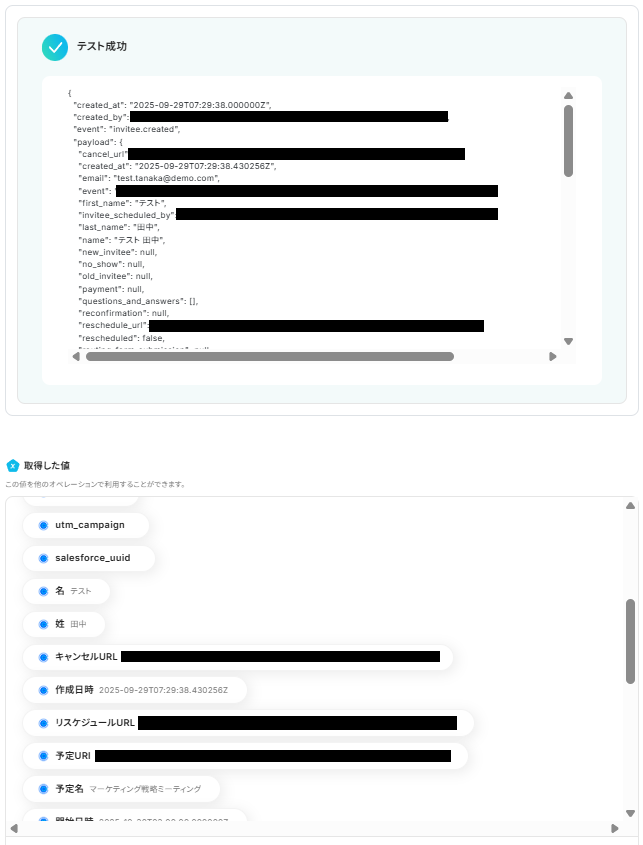 テストが成功すると取得した値が表示され、Calendlyのデータが確認できます。「保存する」をクリックして完了です!