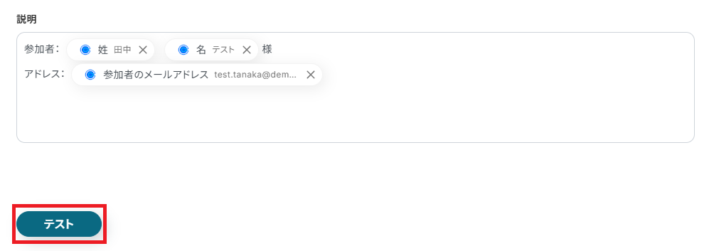 ここまで完了したら連携テストを行います。Yoomに戻りテストボタンをクリックしましょう。