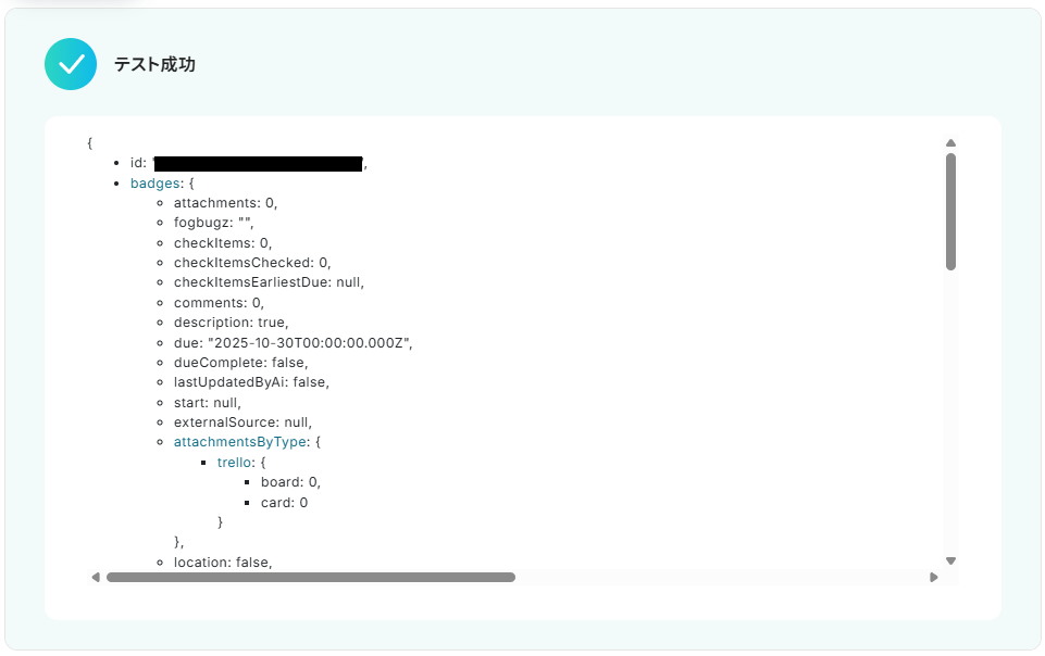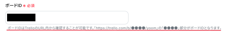 なお、各ボックス下部にある説明の通り、TrelloのオペレーションでそれぞれのIDを取得するアクションを設定する必要があります。