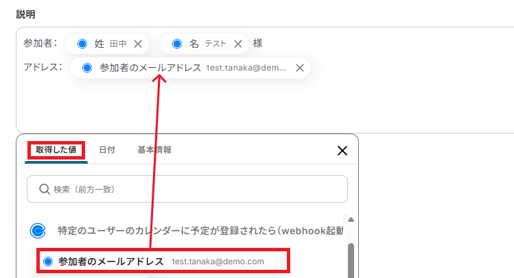 下記のように用途に合わせて、使用したい値や内容を変更してみてください。なお、取得した値を活用せずテキストを直接入力した箇所は固定値のため定型文となります。