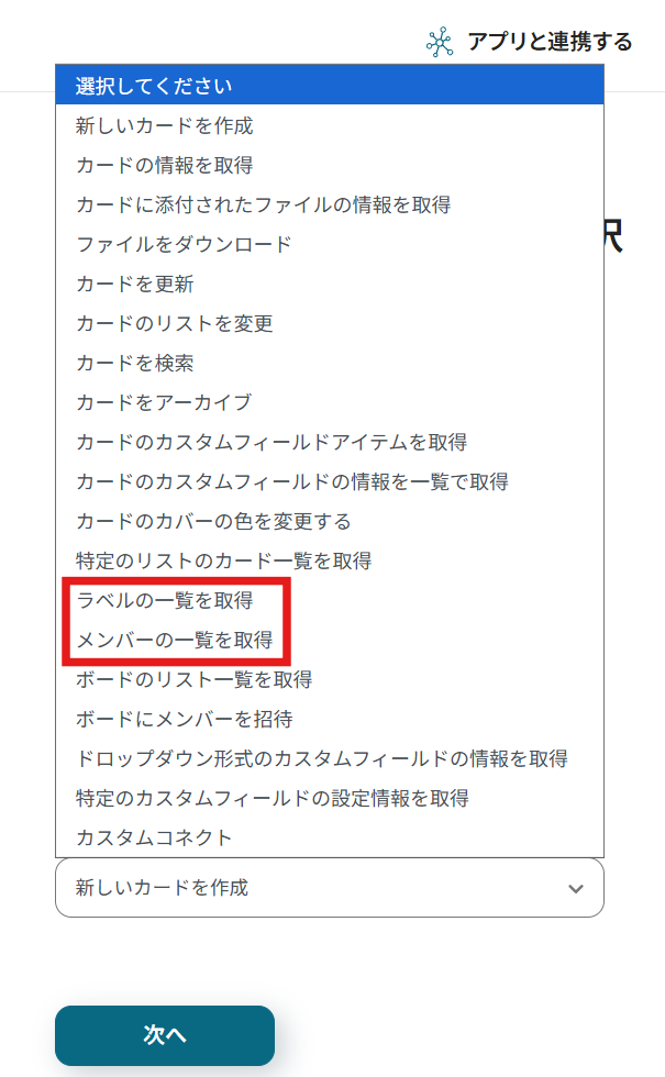 Trelloカード作成の設定を進めます。