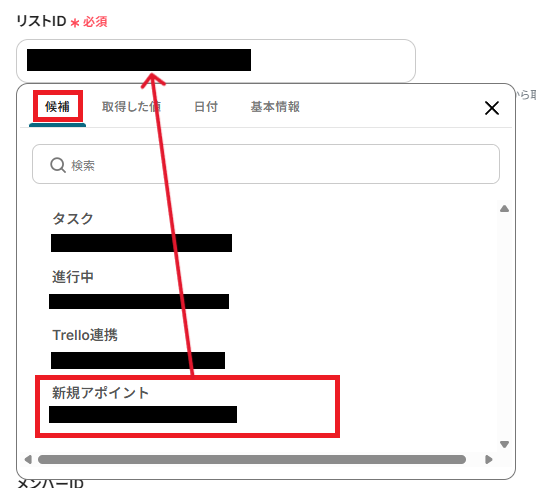 「リストID」は、カードを追加したいリストを候補から選択してください。