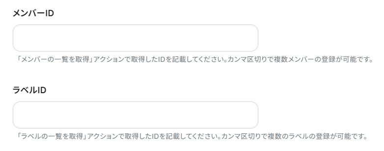 Trelloのアクション設定にて「メンバーID」と「ラベルID」を入力することで、自動で設定することができます。