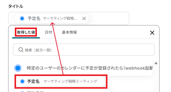 「タイトル」は、取得した値から予定名を設定しましょう。
