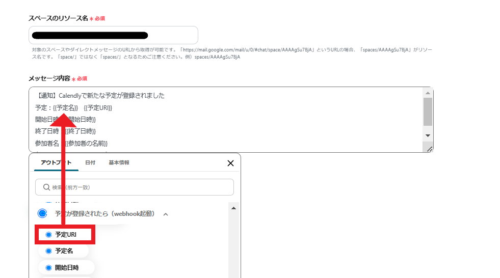 3.スペースのリソース名、メッセージ内容を設定していきます。