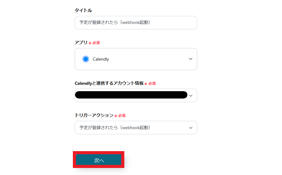 Calendlyと連携するアカウント情報を入力します。