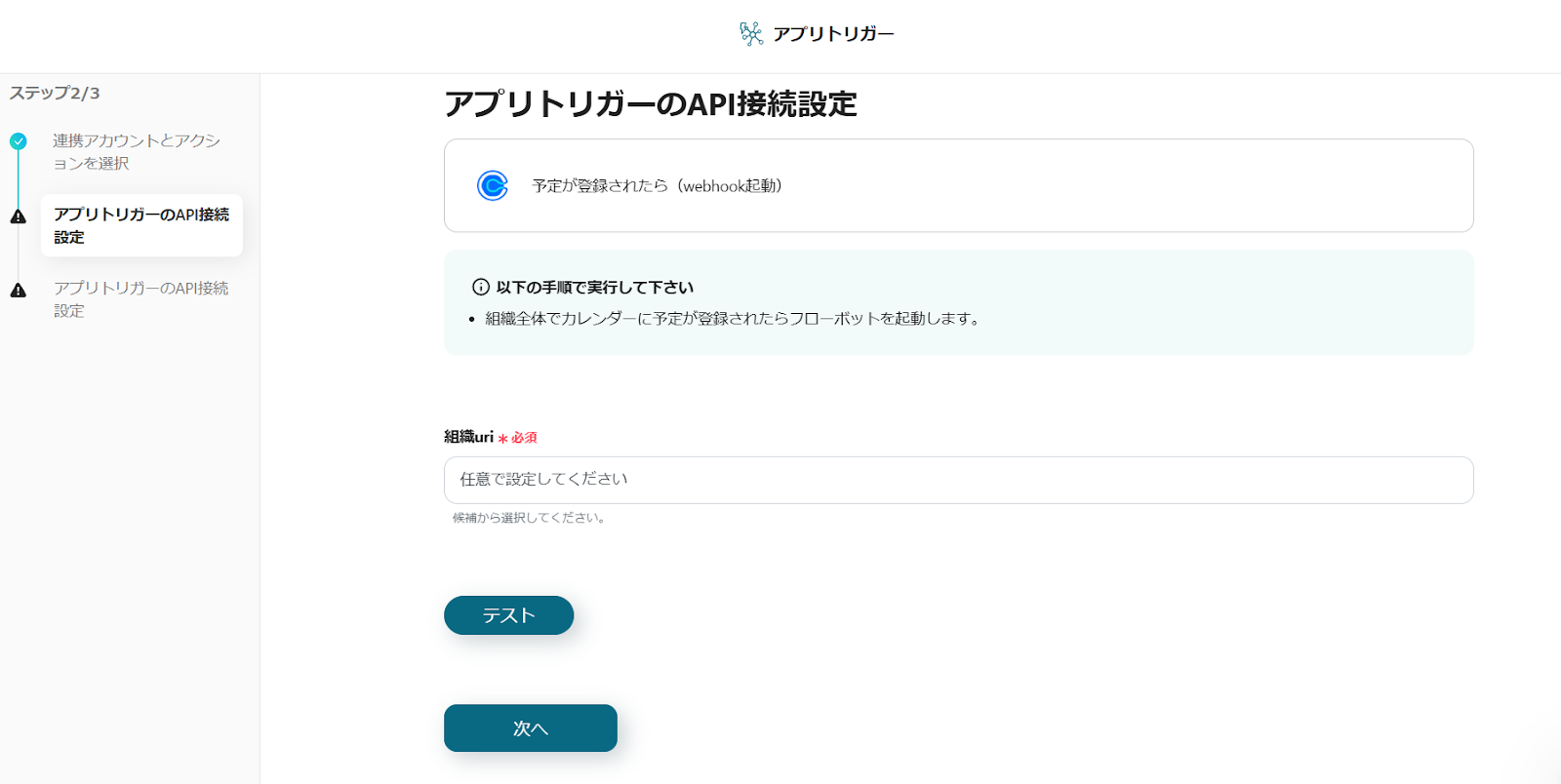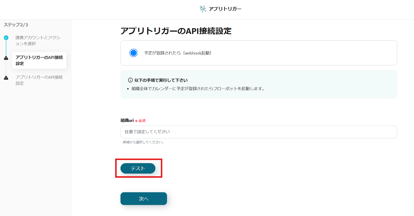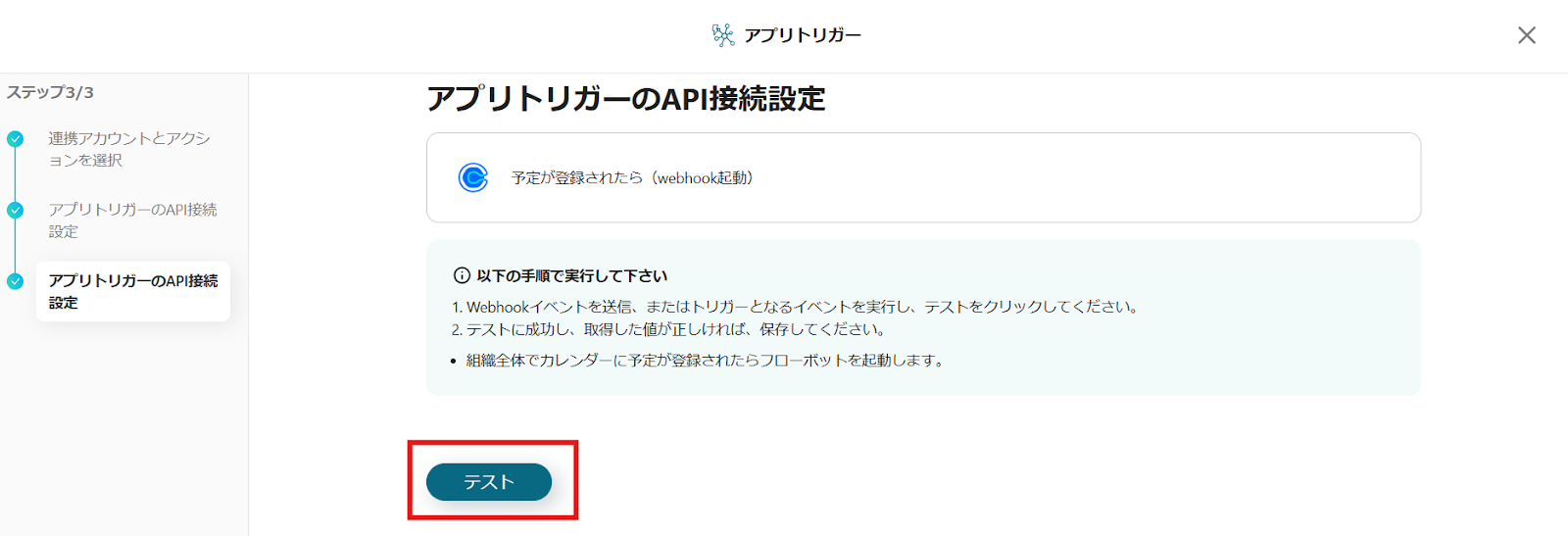 Calendlyにイベントを作成してください。その後、再び赤枠のテストボタンをクリックします。