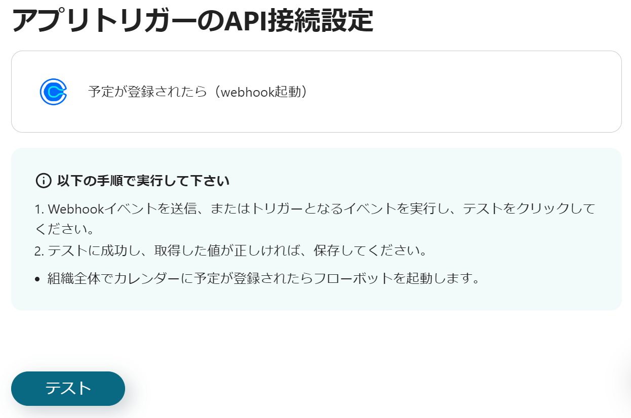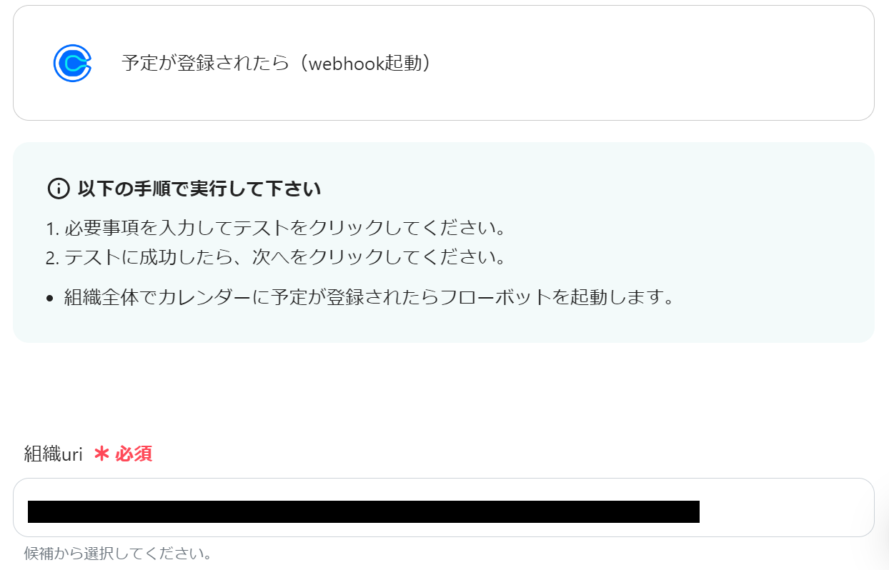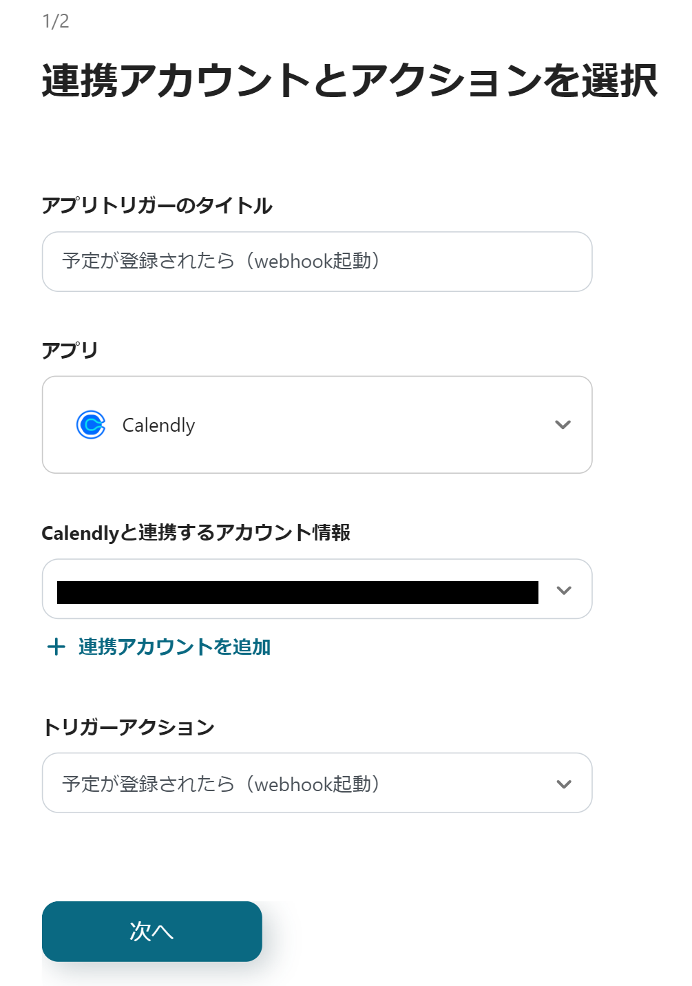 最初にCalendlyの設定を行うので、「予定が登録されたら(webhook起動)」をクリックします。