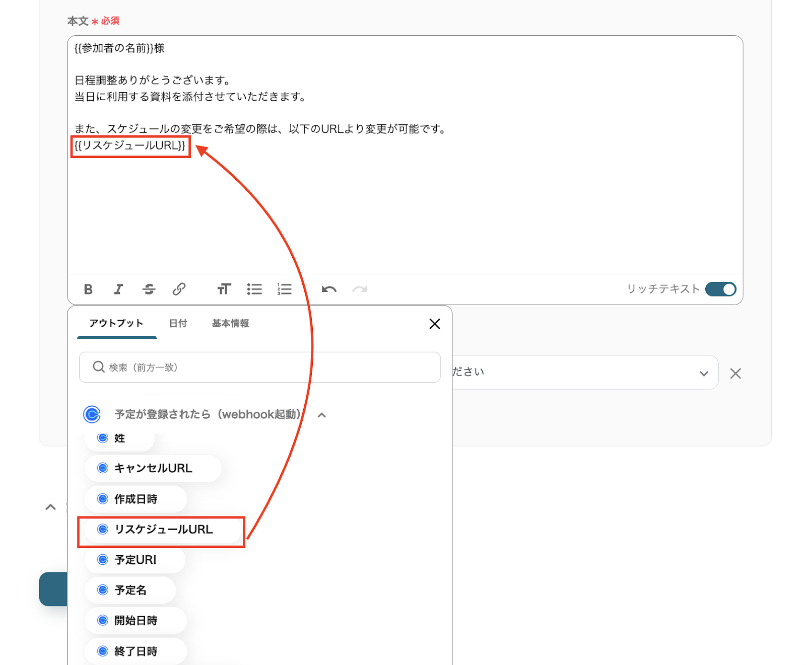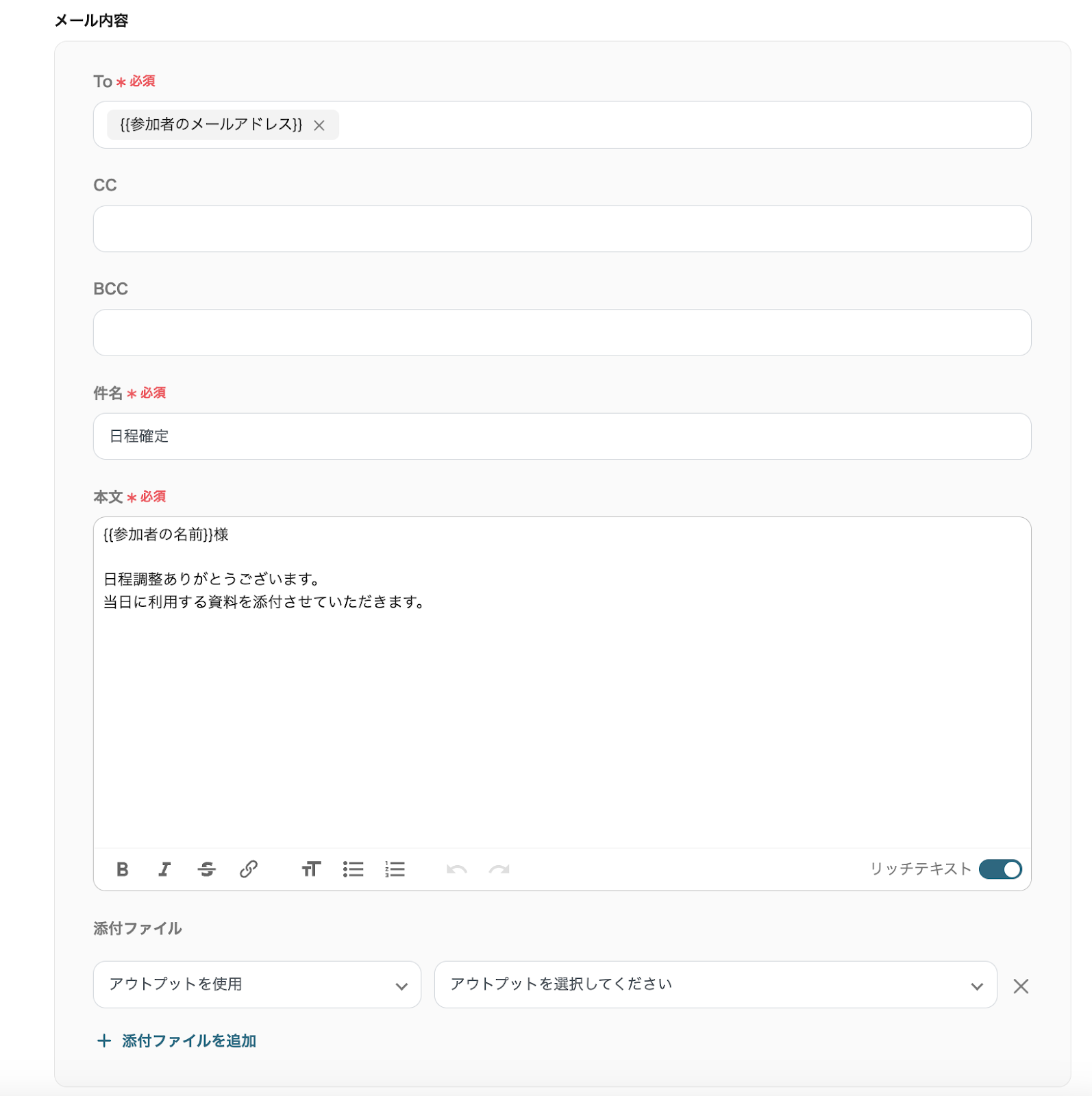 定型文とアウトプットを引用することで、登録された予定に合わせた内容を作成できますので、必要に応じて変更してください。
