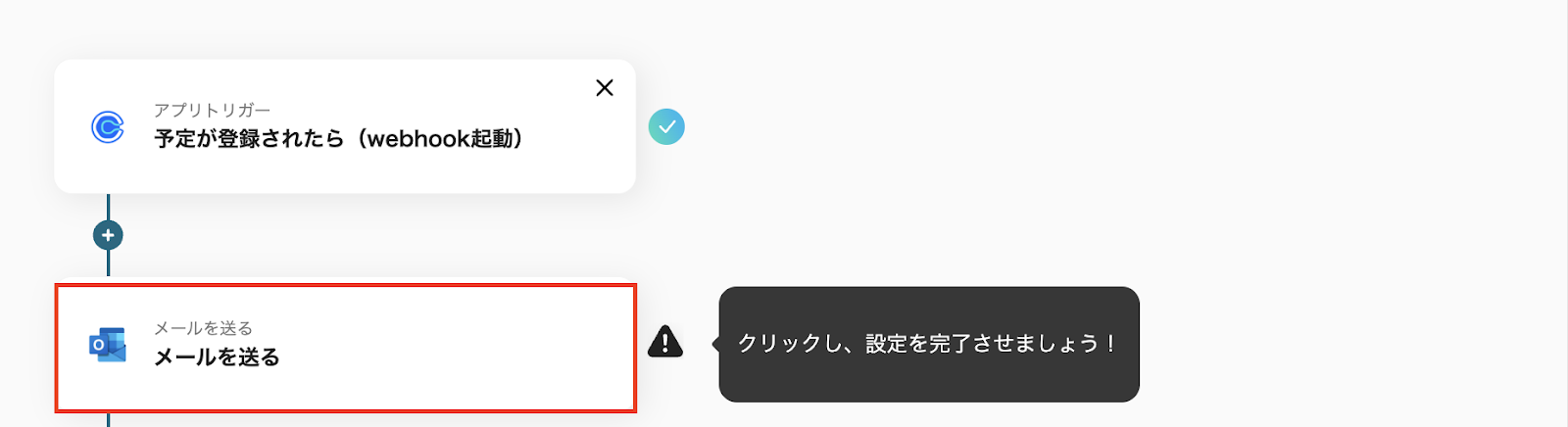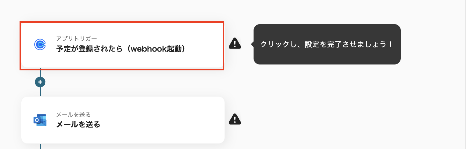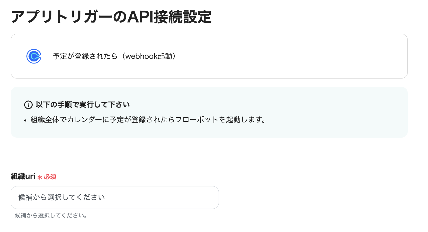 ・トリガーアクション:「予定が登録されたら(webhook起動)」を選択します