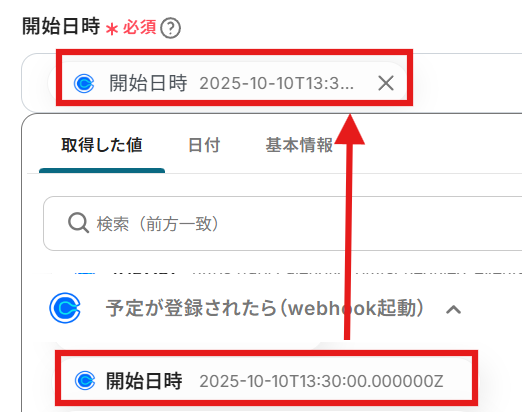 ・値:①のフォームで取得した開始時間を{{○○}}のように埋め込みます。(アウトプットを埋め込む)