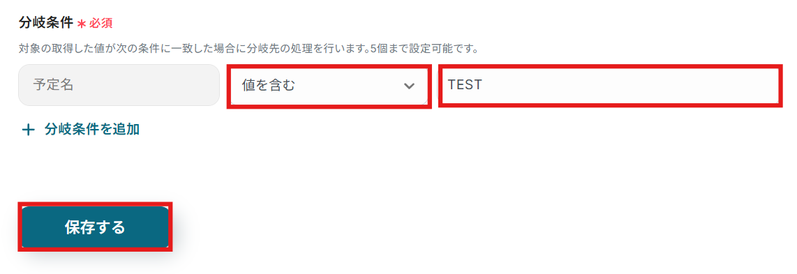 分岐条件を設定します。今回は「TEST」という値を含む場合のみ、この後設定するアクションに進むようにしてみました。