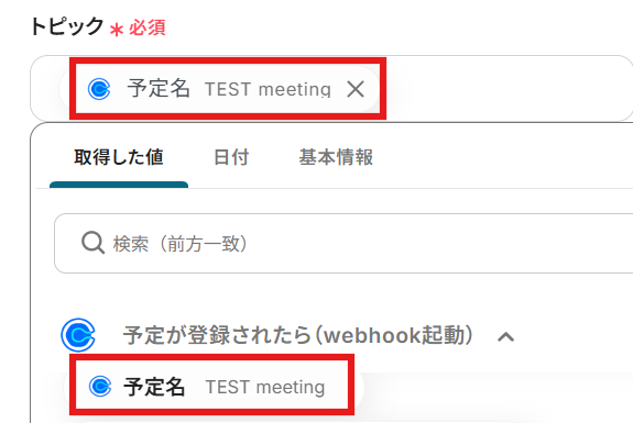 トピックの欄は先ほどCalendlyのトリガー設定時に取得した値の中から選びましょう。