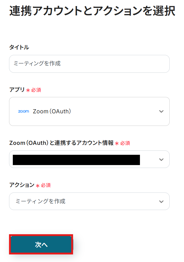 ステップ5:Zoomでミーティングを作成するアクション設定