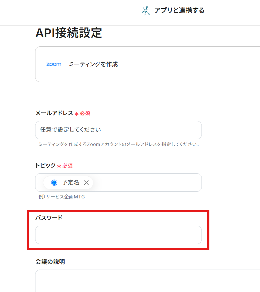 ・メールアドレス:ミーティングを作成するZoomアカウントのメールアドレスを入力します。
