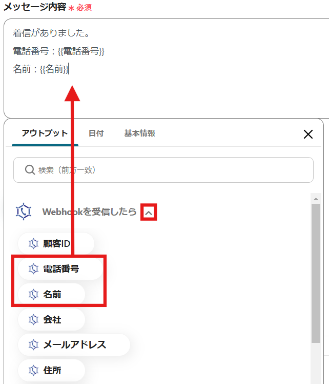CallConnectのアウトプットを活用して、メッセージを設定しましょう。
