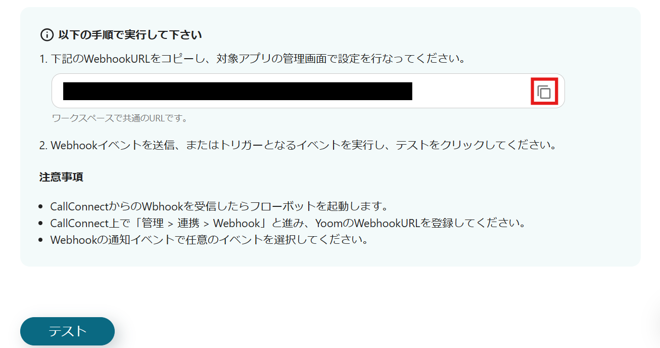 以下の画面が表示されるので、赤枠内をクリックし、Webhook URLをコピーしましょう。