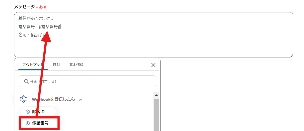 以下の場合だと、メッセージ内容にCallConnectから取得した電話番号を挿入する形になります。