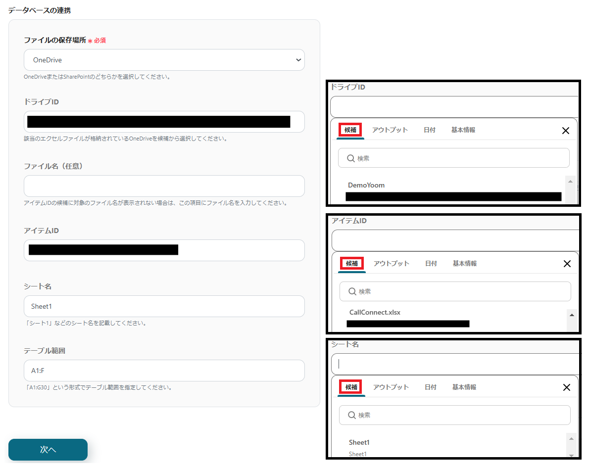 ※ドライブID、アイテムID、シート名は、枠をクリックして表示される「候補」から選択できます。