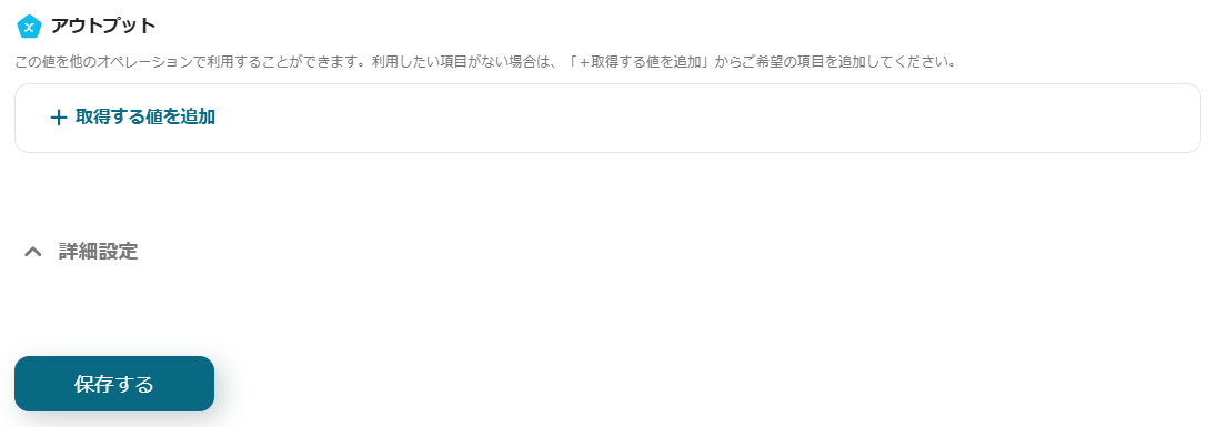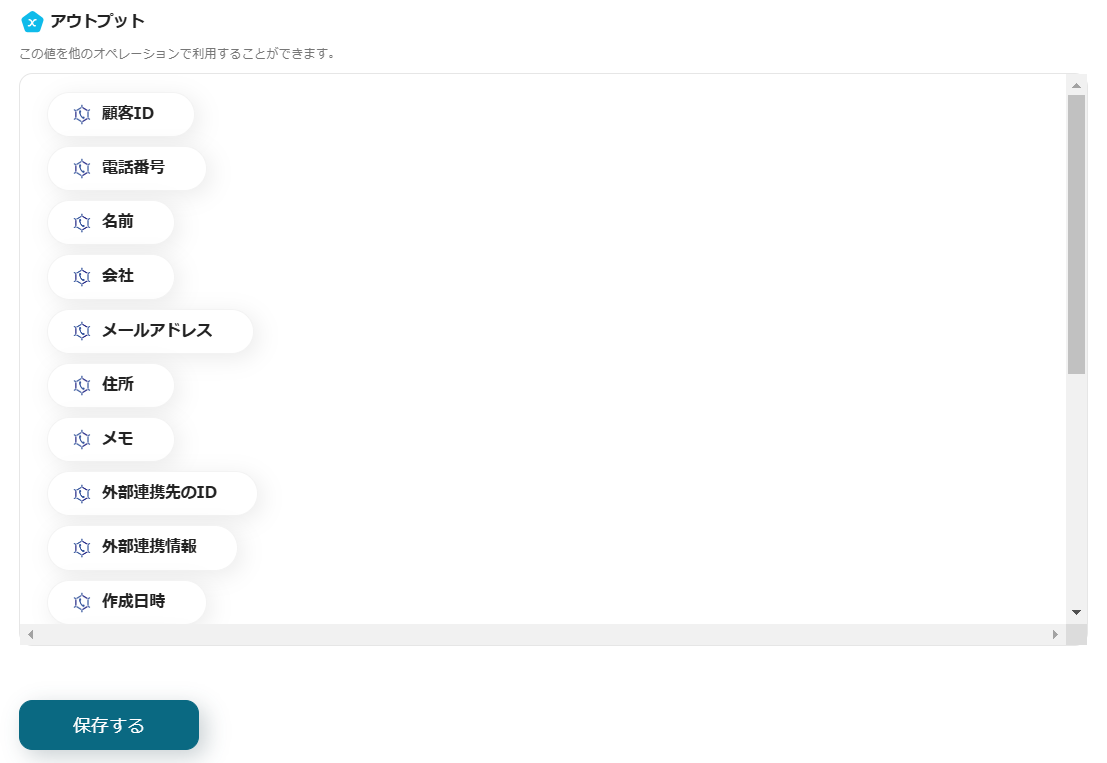 ※各項目には、アウトプットの「Webhookを受信したら」から対応する項目を設定します。(値は二重括弧で表示されます)これにより顧客ごとに変わる情報を動的に反映できます。