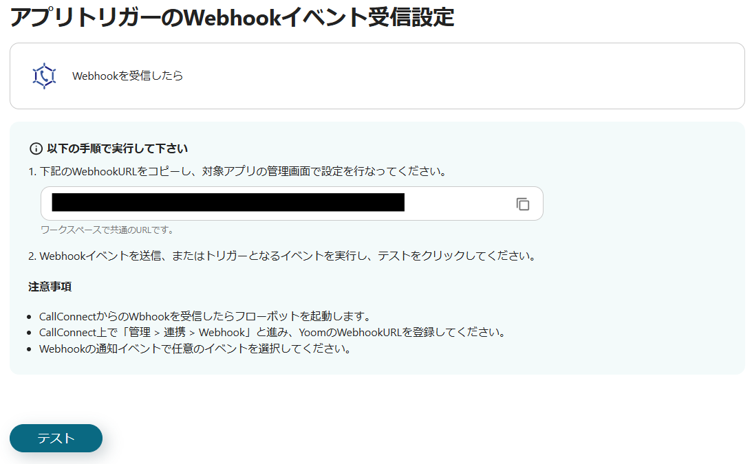 4.WebhookURLをコピーし、CallConnectに設定した後、テストを行います。