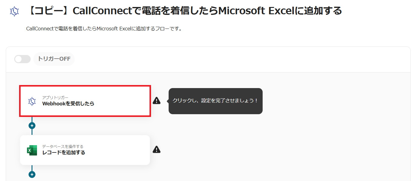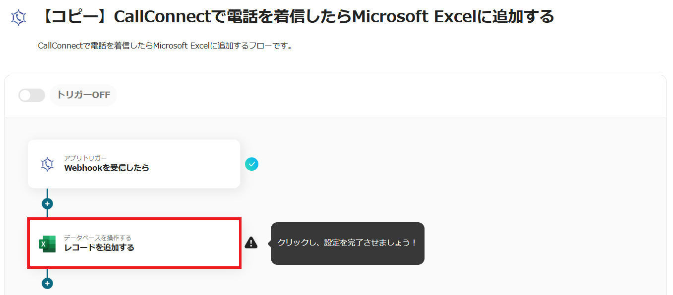 6.トリガーをONにすると、CallConnectで電話を着信するたび、Microsoft Excelに自動でレコードが追加されます。