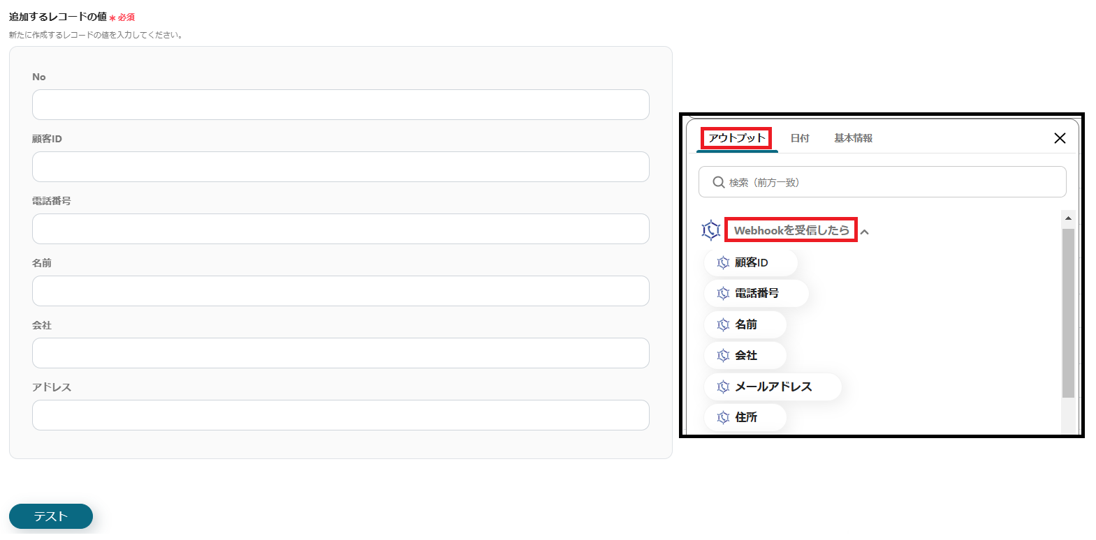 4.追加するレコードの値に、設定したシートの項目が表示されます。
