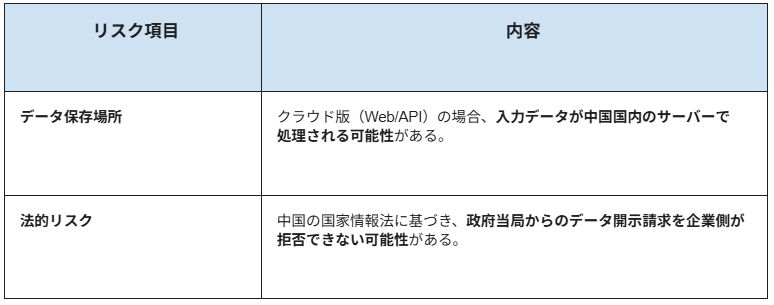 そのため、機密情報や個人情報(PII)を含むデータは絶対に入力しない、あるいはオンプレミス版を利用して自社環境で運用するなどの対策が推奨されます。