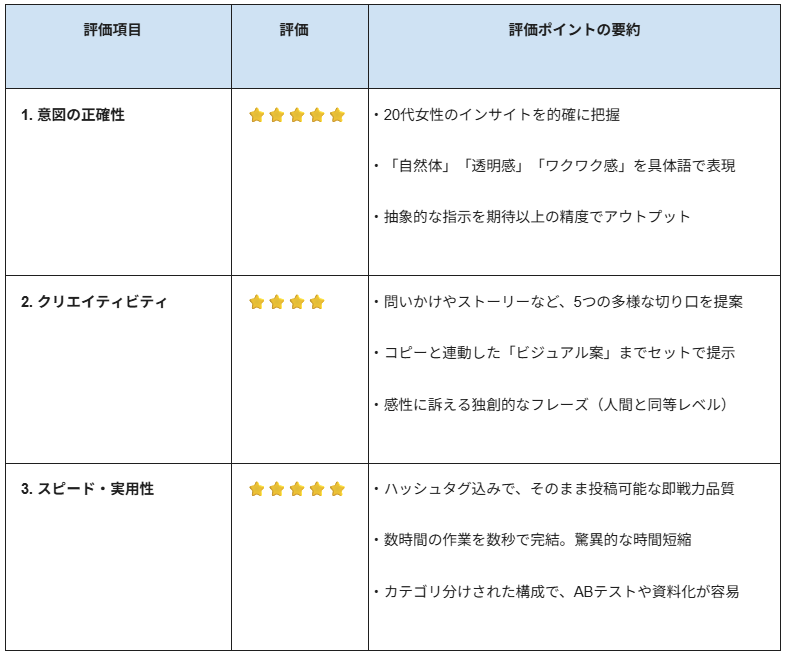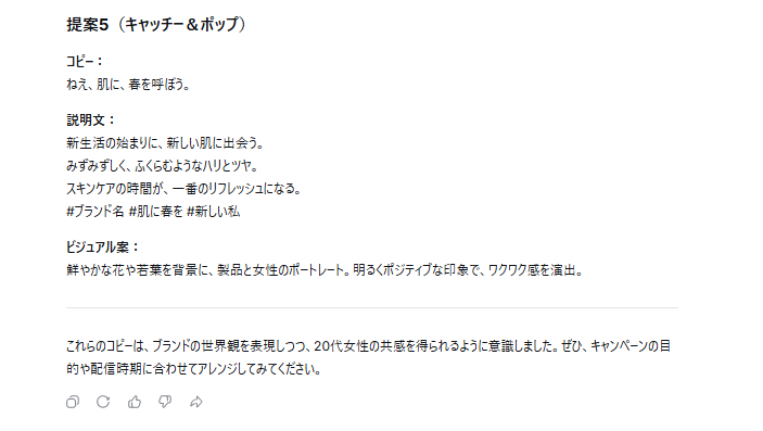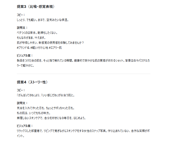 「『がんばってるね』より、『いい感じだね』が似合う肌に」といった、感性に訴えかける独創的なフレーズが含まれており、人間が書いたコピーと比較しても遜色ないレベルに達しています。