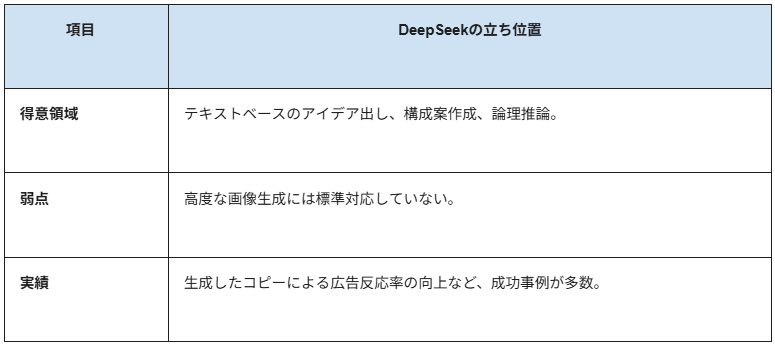 以下に、クリエイティブ分野におけるDeepSeekの強みをまとめました!ぜひ、参考にしてみてください。