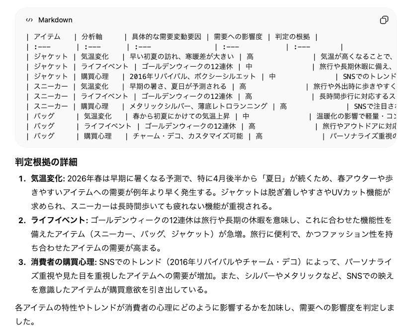 次に、Geminiが集めた情報をChatGPTに渡し、商品ごとの需要要因をわかりやすく表に整理してもらいます。