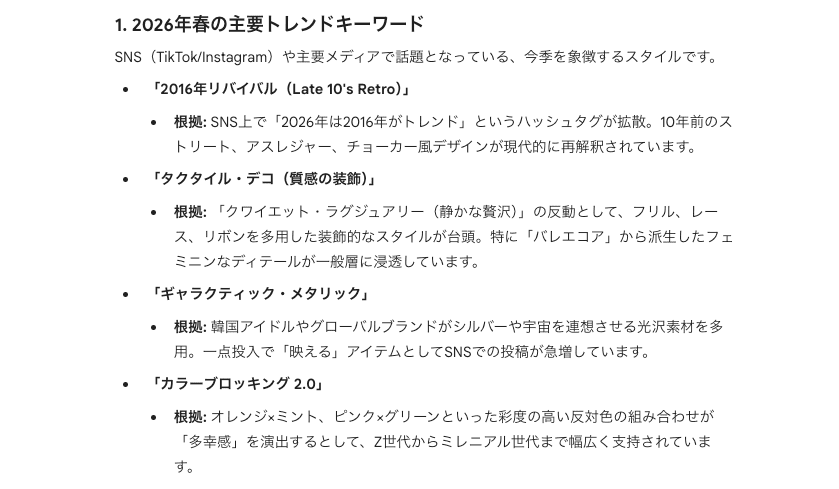 統計データなど、過去の数値だけでは捉えきれない「2026年特有の12連休」や「SNS発の2016年リバイバル」といった非構造的なトレンドを、ビジネスの判断材料へと昇華できる点は、生成AIならではの真骨頂です。