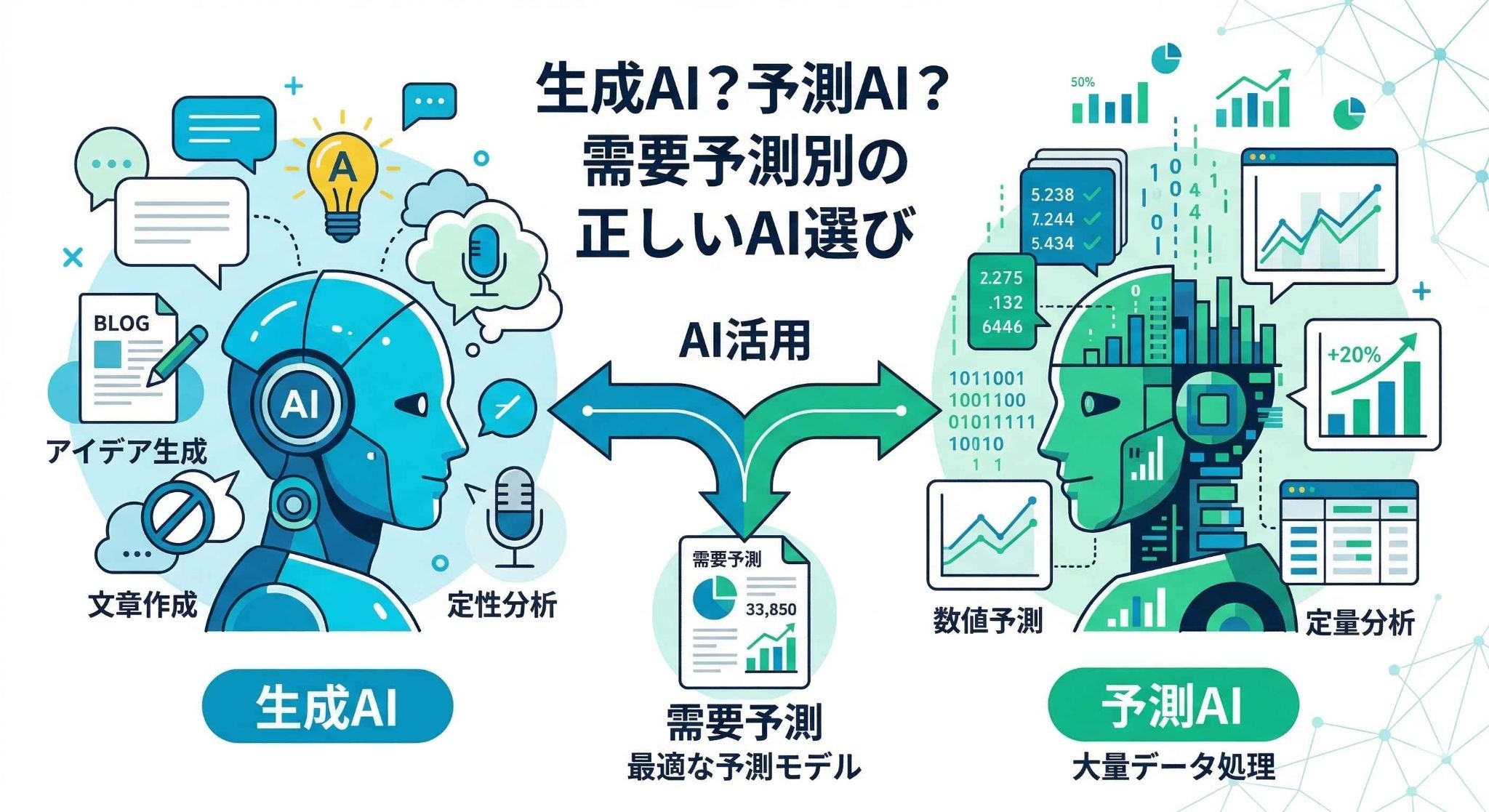 需要予測にAIを活用しようと考えた際、まず理解しておきたいのが「生成AI」と「予測AI」の違いについてです。これらは同じAIという括りでありながら、得意とする処理や目的が大きく異なります。