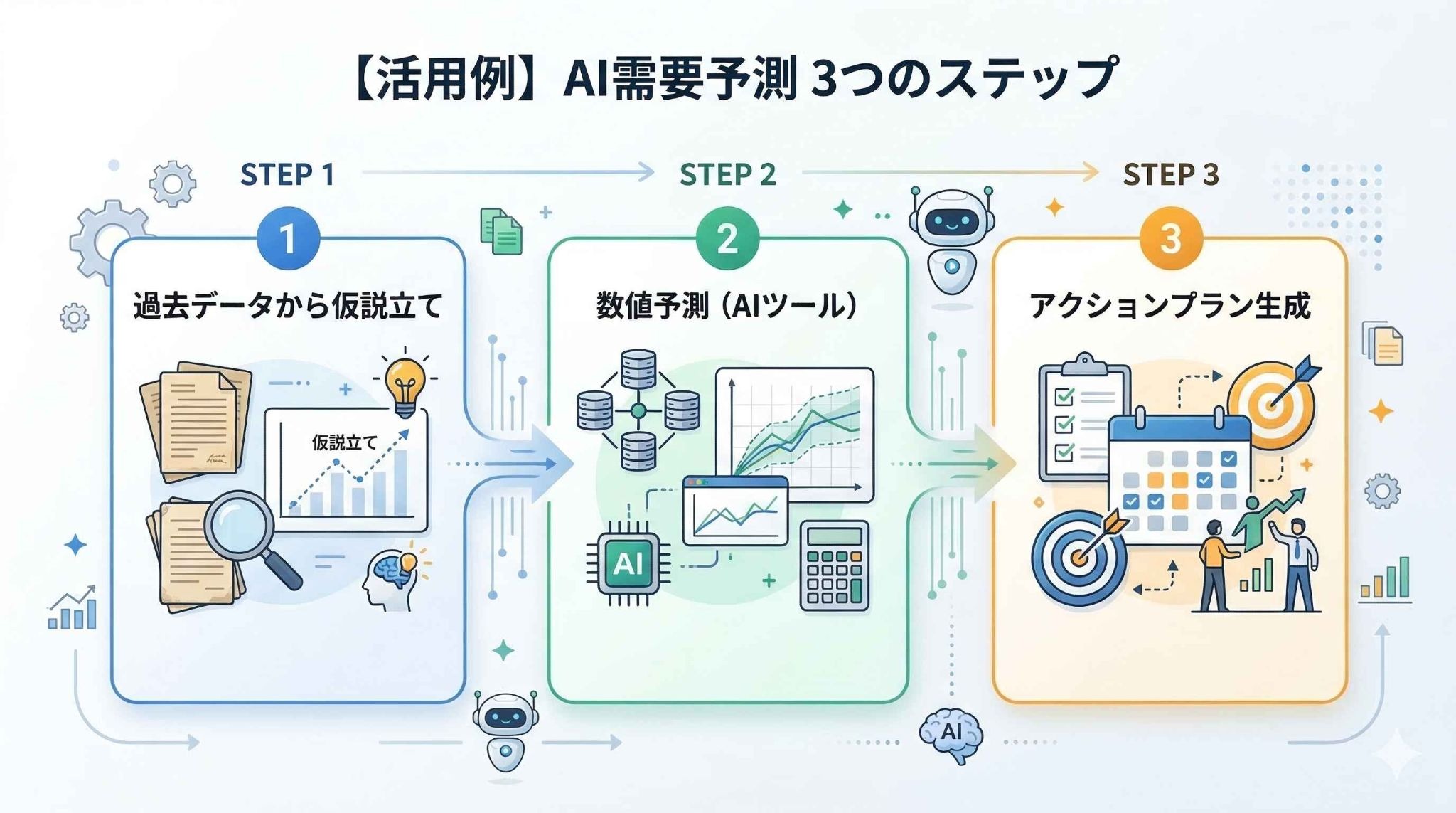 生成AIを実務に組み込む際、予測AIと連携させることでその真価を発揮します。ここでは、生成AIを需要予測の「 前処理 」や「施策の具体化」に活用する、一般的なステップをご紹介します。