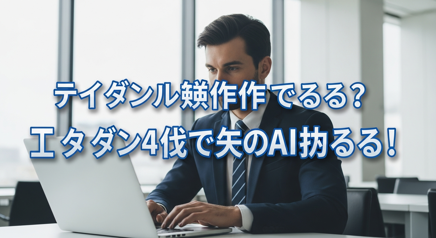 現代的なオフィスでノートパソコンを開いて作業しているビジネスマンの写真。画像の中心に大きく「サムネイル作成を効率化できる?Imagen 4から始まるAI時代の働き方改革!」というタイトル文字が配置されている。文字は青色で、未来的で立体的なデザイン。背景のオフィスは写真のように明瞭にする。