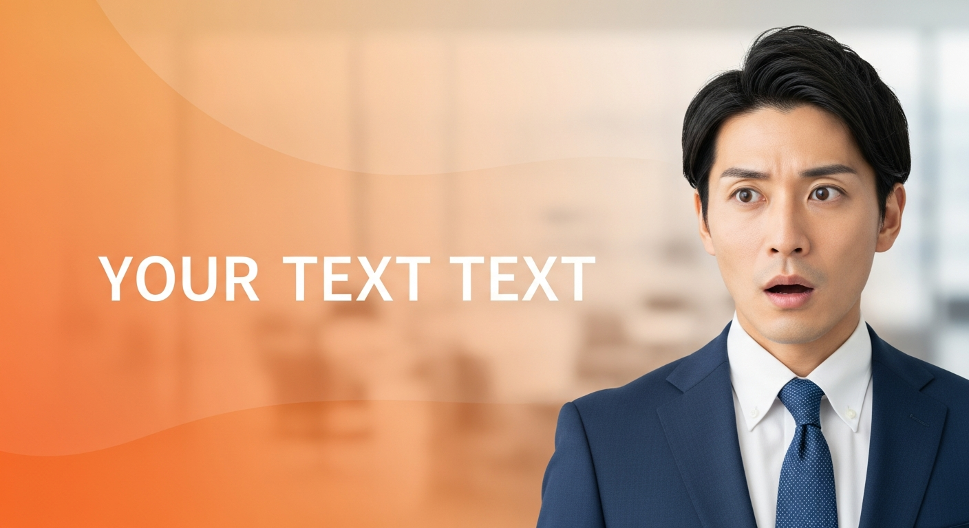 画面の右側3分の1に、プロフェッショナルな日本のビジネスマン(ネイビーのスーツ着用)を配置。