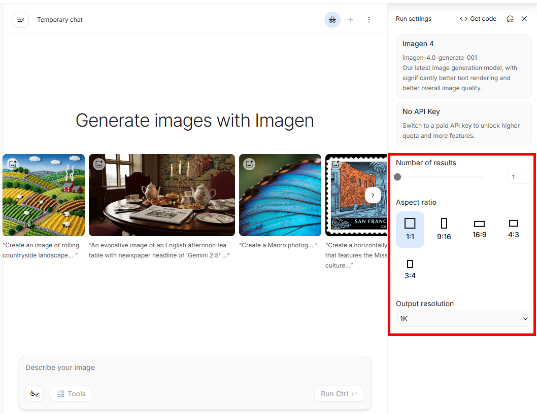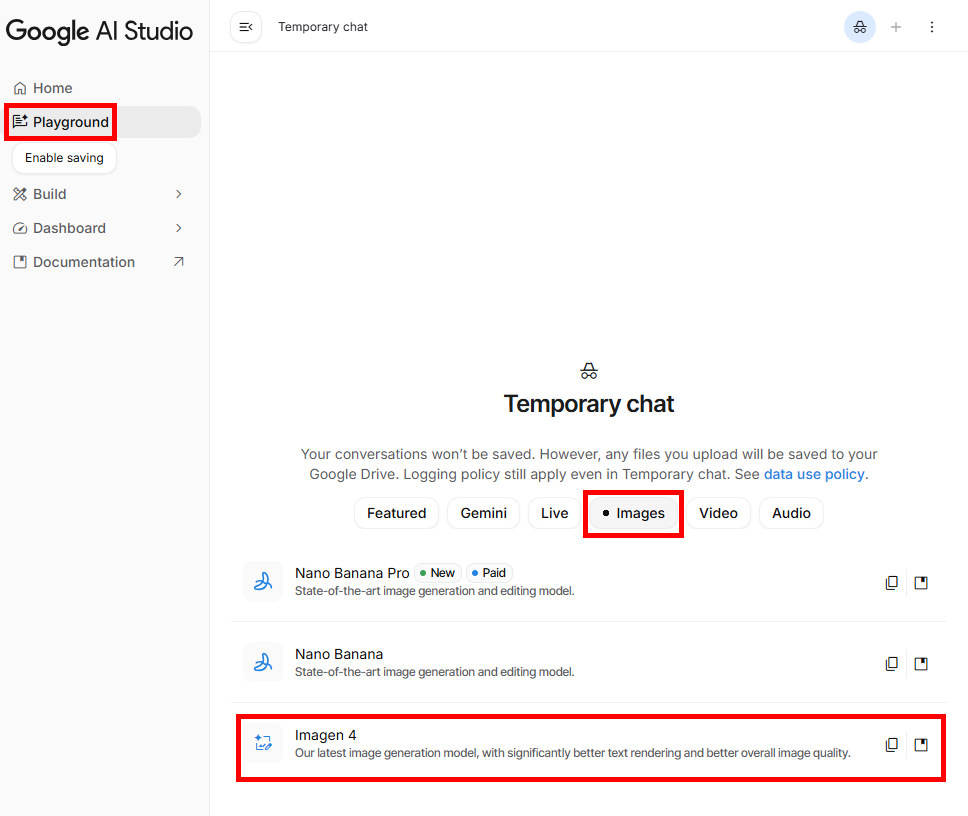 ログインしたら、「Playground」→「Images」→「Imagen 4」の順番でクリックします。