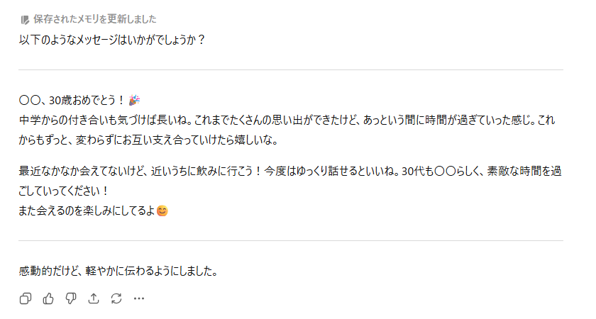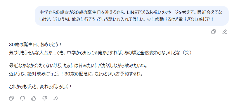 文章の雰囲気に差はあるものの、日本語としては特に崩れることなく自然体なメッセージ内容を提案してくれました。